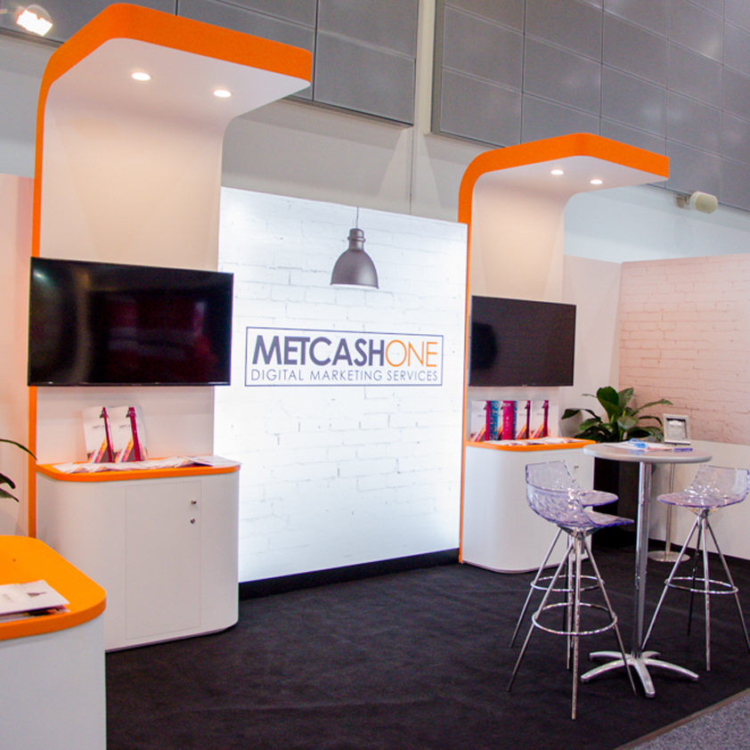- CUSTOMISE - Location of structure and separate counter units in stand area is flexible. Edge trim paint colour to match client colours.