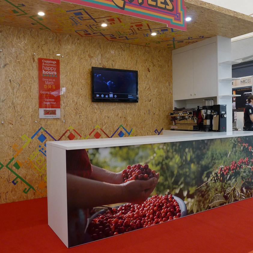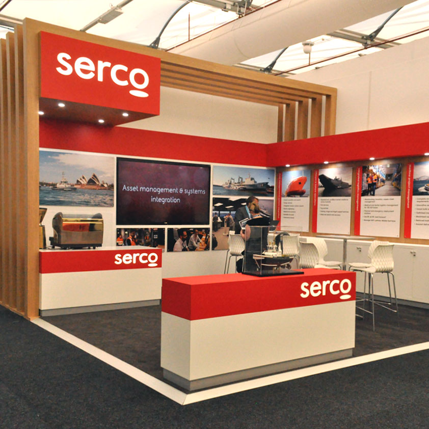 For example: An Octanorm structure with custom-built counters or 3D prop features.