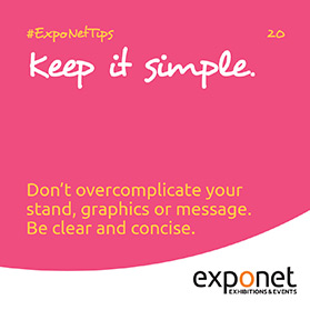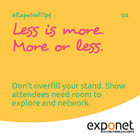 Stay away from excess. Don't fill every square metre of your stand with furniture, don't cover your graphics in big blocks of text, don't stand there and do all the talking. Keep your message simple.