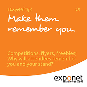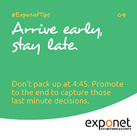 The last hour of the day is often the 'golden hour' with many attendees rushing about trying to make their final decisions before a show closes. Capitalise on this by staying on your stand for as long as possible. Don't start packing up at 4:45pm and closing for the day, keep promoting right until the end. You may even find your competitors have disappeared for the day and your are all that is left!