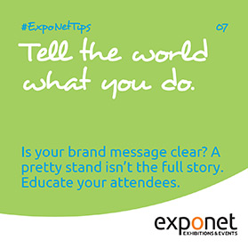 Don't just build yourself a pretty looking exhibition stand. Be sure to convey what your company actually does! You must tell the world what you do... and the best way to do that is with effective signage and branding. It is the only way for attendees to understand your exhibit and judge whether they should talk to you.