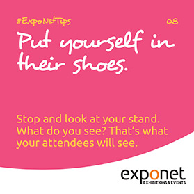 Pretend you are your customer. Step off your stand and into the aisle, turn around and look at your stand. What do you see? Can you see your company name clearly? Can you find products easily? Can you read your signage comfortably? This is the experience of your customer. Make it a good one.