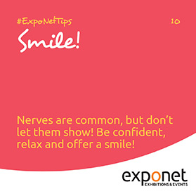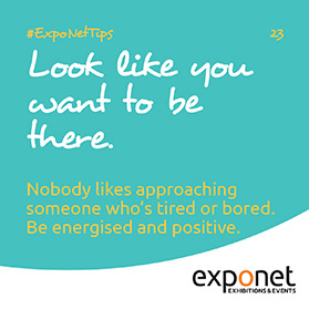 Nobody likes approaching someone who seems tired, annoyed, bored or busy. An exhibition is a fantastic opportunity for you as a marketer - you should want to be there, so look like you want to be! Be energised, positive and smile. It can be hard work some days, but worth the reward.