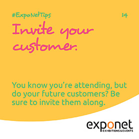 Be sure to send out letters to your relevant contact database with the show details, your stand location and don't forget to tell them what they'll receive for stopping by! Because there is a reason, right? Why not buy tickets for your top 10 customers and give them away in a competition online via Social Media as additional promotion.