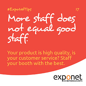 Buyers are looking for quality. Quality staff will serve, explain and capture information to and from clients in a brand-positive way. Having too many staff on your stand can not only seem squashed, but can potentially highlight a lack of interest with those standing around.