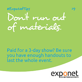 If you've paid for a 3-day show - make sure you have enough promotional material for 3 days! The last thing you want is to run out of handouts mid-way through the second day and then lose all of those potential buyers simply because they won't remember you.