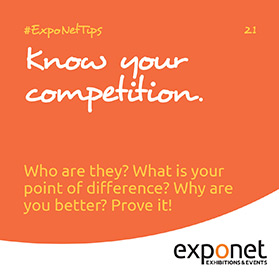 Who are your competition? Are they exhibiting at the same show as you? Do you know what their regular sales or discount technique are? Do you know their products? How are yours any different/better? Potential customers will be shopping for the best value for money, and may ask you why they should choose your product over the competition.
