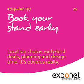 Once you know you want to exhibit, book your stand space early! You will have a choice of stands, time for planning and may be eligible for an early booking discount. In addition to the obvious benefits, you'll also have more time to establish budgets, designs and product.