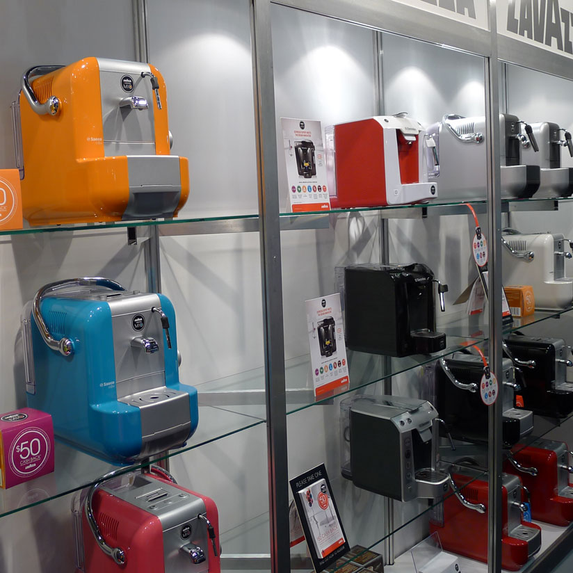 Your stand may be built using one of two systems, Octanorm or Corinthian. This will affect some of your options with regard to shelving. You need to find out which of these systems your stand is being built in before you can make decisions about placement of your shelves. To see an example of each system go to Exhibition Stands on the ExpoNet website and select the Modular Stands option.